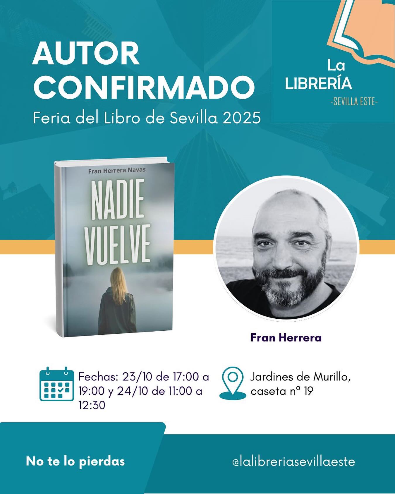septiembre 6, 2025 @ 12:00 - 12:30 Presentación thriller «Nadie vuelve» de Fran Herrera Navas La librería de Sevilla Este Av. de las Ciencias, 38, local 5, Sevilla